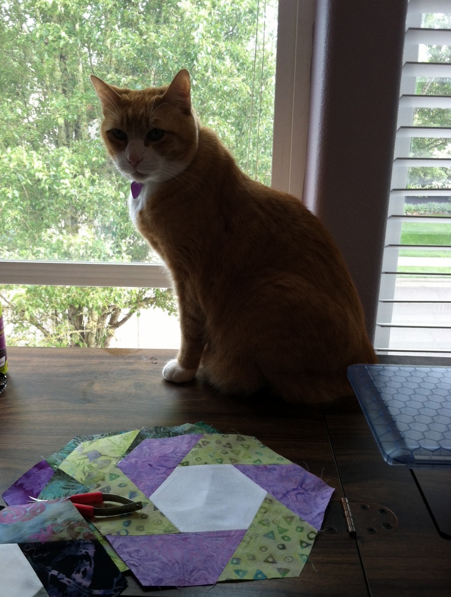 My next project involves sewing together lots of hexie shapes! This is a pattern called Snack Time by Jaybird Quilts. I was piecing together some of the shapes when my orange cat made an unexpected move and came to sit behind my sewing machine! Normally, he will only sit on the floor of my sewing room to do his inspection work. The lighting wasn’t great, but I had to take a quick pic before he moved.