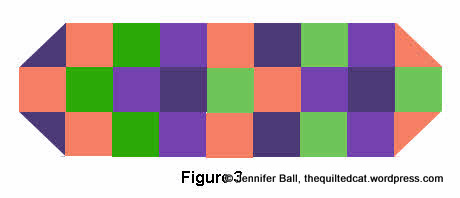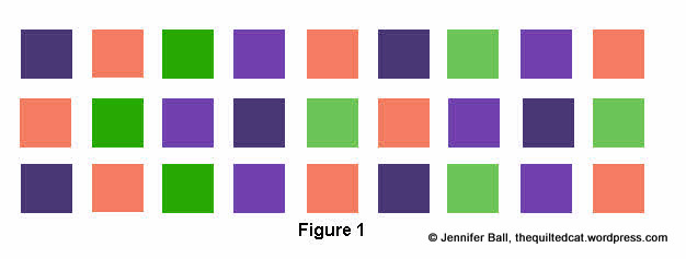 1. Lay out your charm squares into 3 rows of 9 squares each. Move the charm squares around until you find a color arrangement that you like. Note: If you have a cat “assistant,” you may find your squares re-arranged! See figure 1.