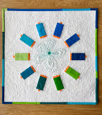 Since I was at the beach, I decided to be adventurous with my free-motion quilting by stitching a sand dollar shape using Aurifil #4654. This is a lovely green and blue variegated thread in 50 weight. For the background quilting, I did all over free-motion swirls using Aurifil 2024 in 50 weight, and it blended perfectly with the Kona White.