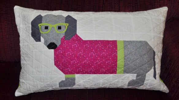 This pattern uses traditional piecing methods and comes together pretty quickly. I pieced the dog with Aurifil 2600, a light gray/silver color, in 50 wt. I also used the same thread to quilt diagonal cross-hatching lines across the pillow front.