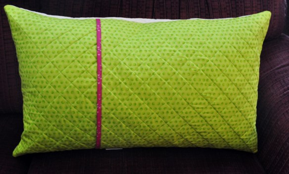 I used Aurifil 5017, a lime green color, 50 wt to stitch around the eye glasses and to do the same diagonal quilting on the pillow back.