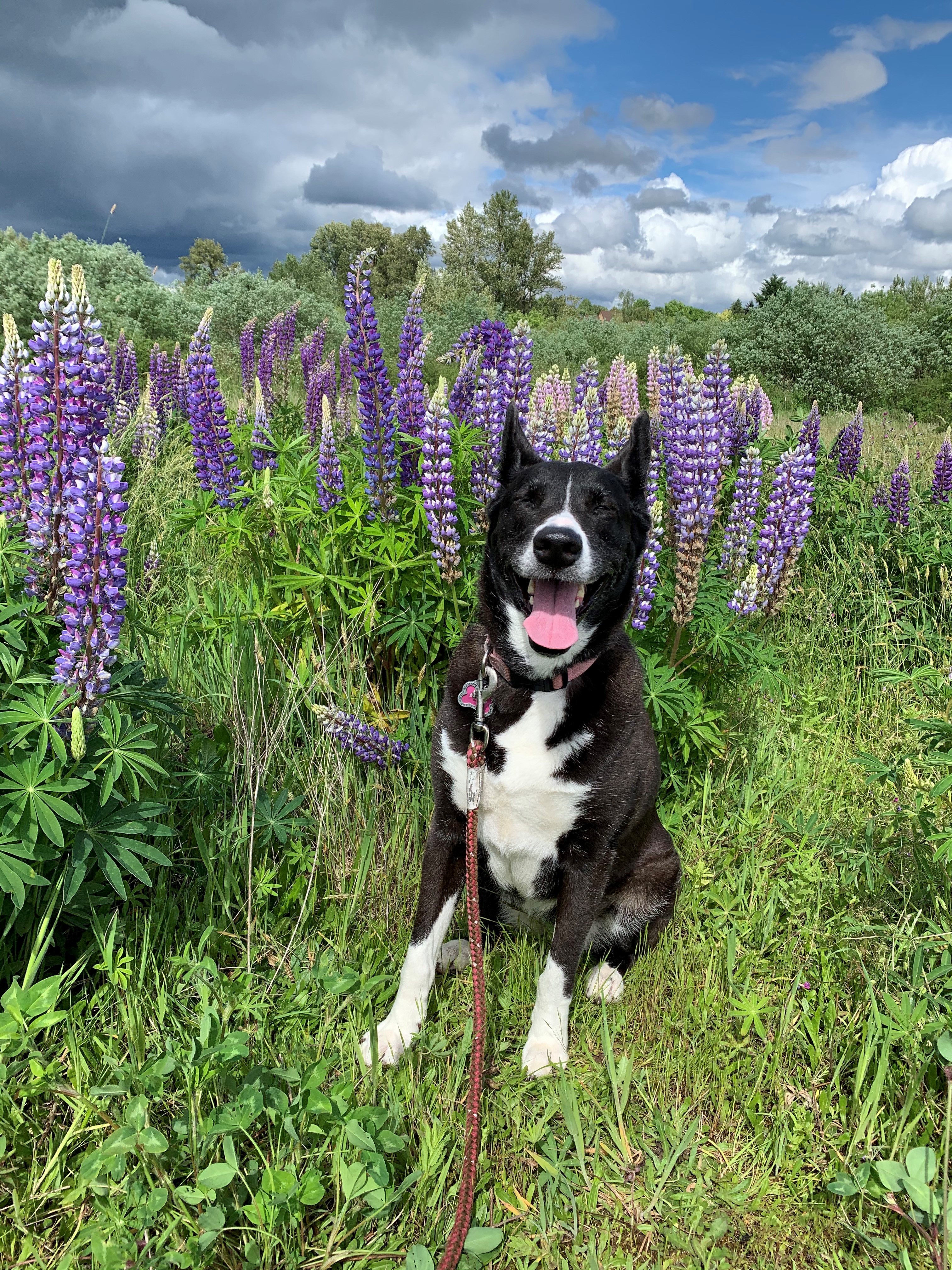 Pepper_lupine1 Published May 14, 2020 at 3024 × 4032 in 2020 Mini Series SAL – Week 8 Pepper laughing in the lupine