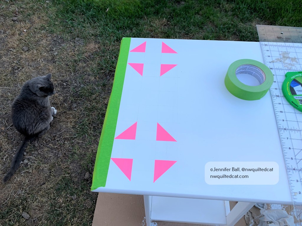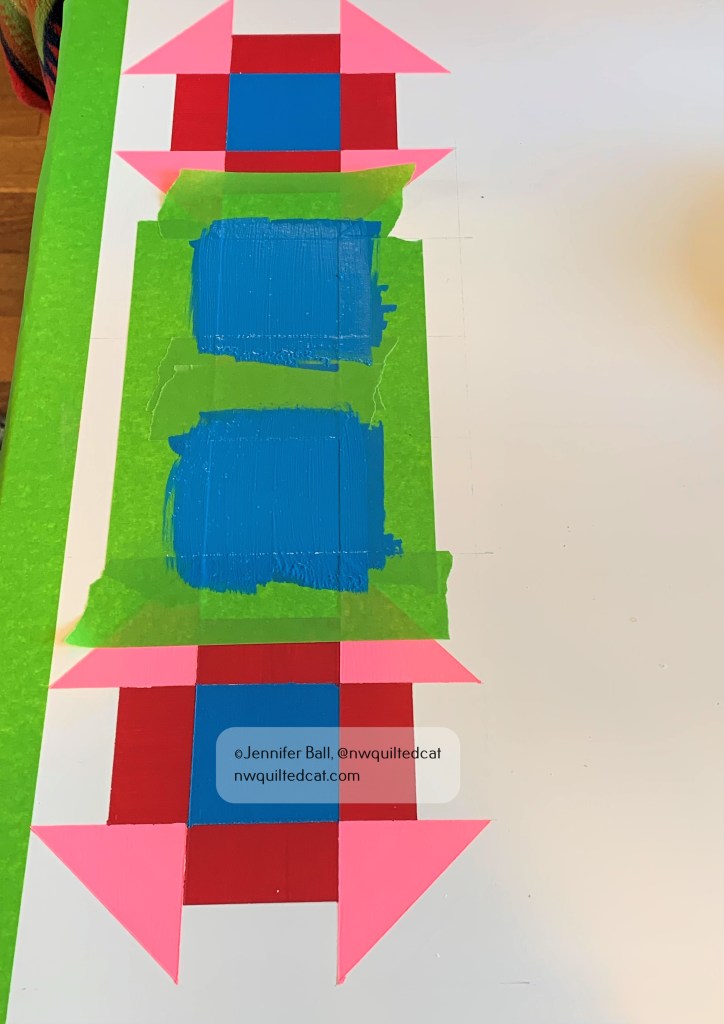 I used FrogTape to mask off the far left side of the table and the initial parts of the churn dash blocks. I used regular craft acrylic paints. Here’s what the first part of the churn dash blocks looked like after they were dried and I removed the tape:
