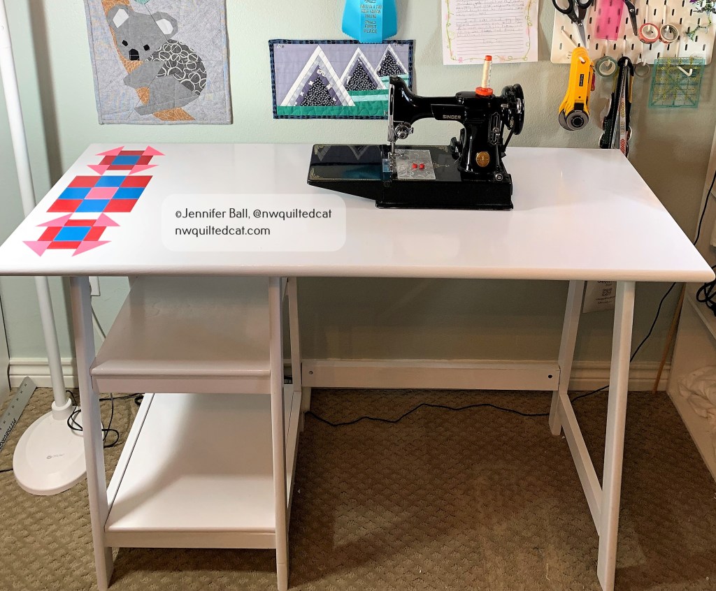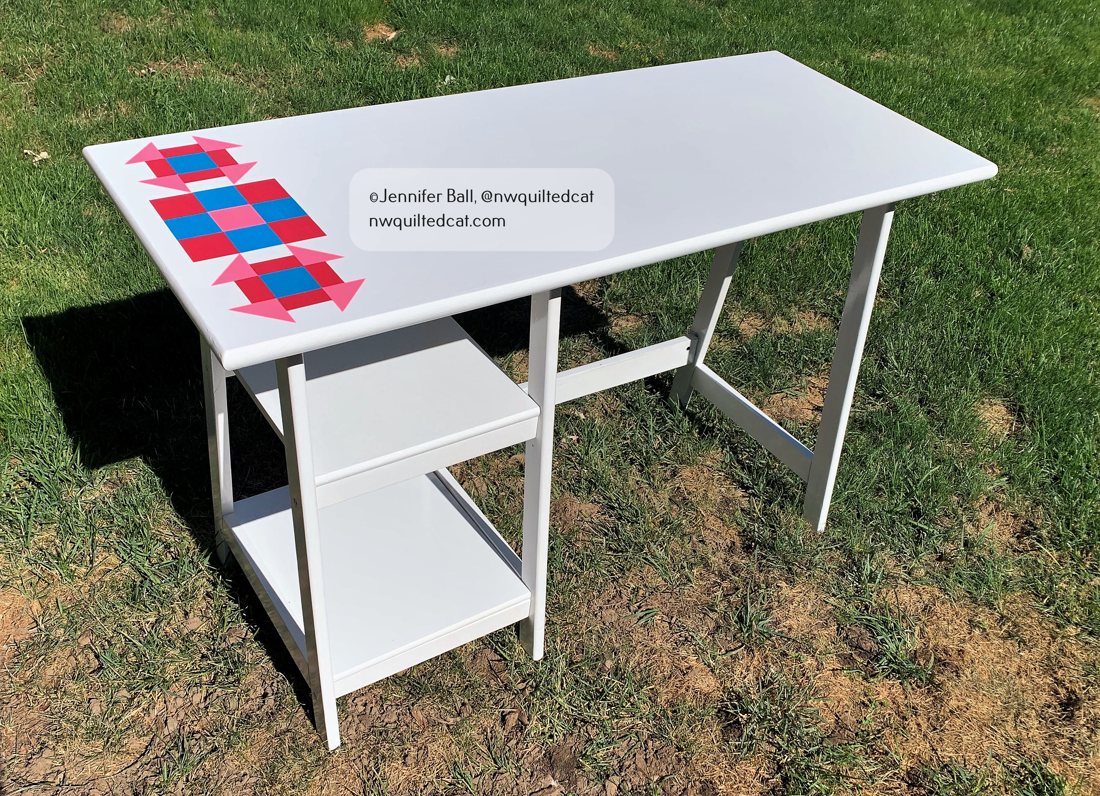 I decided to paint 2 classic quilt block shapes on the left-hand side of the desk top: the churn dash block and the 9-patch block.
