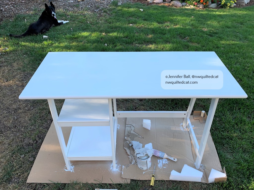 In August, I got my son a different computer desk and so his old desk needed a new purpose. It is about 10 years old and was banged up quite a bit from years of kid, and then teenage, use. I cleaned up the desk, tightened up the screws, and repainted it glossy white. Pepper kindly guarded my work area from squirrel invaders!