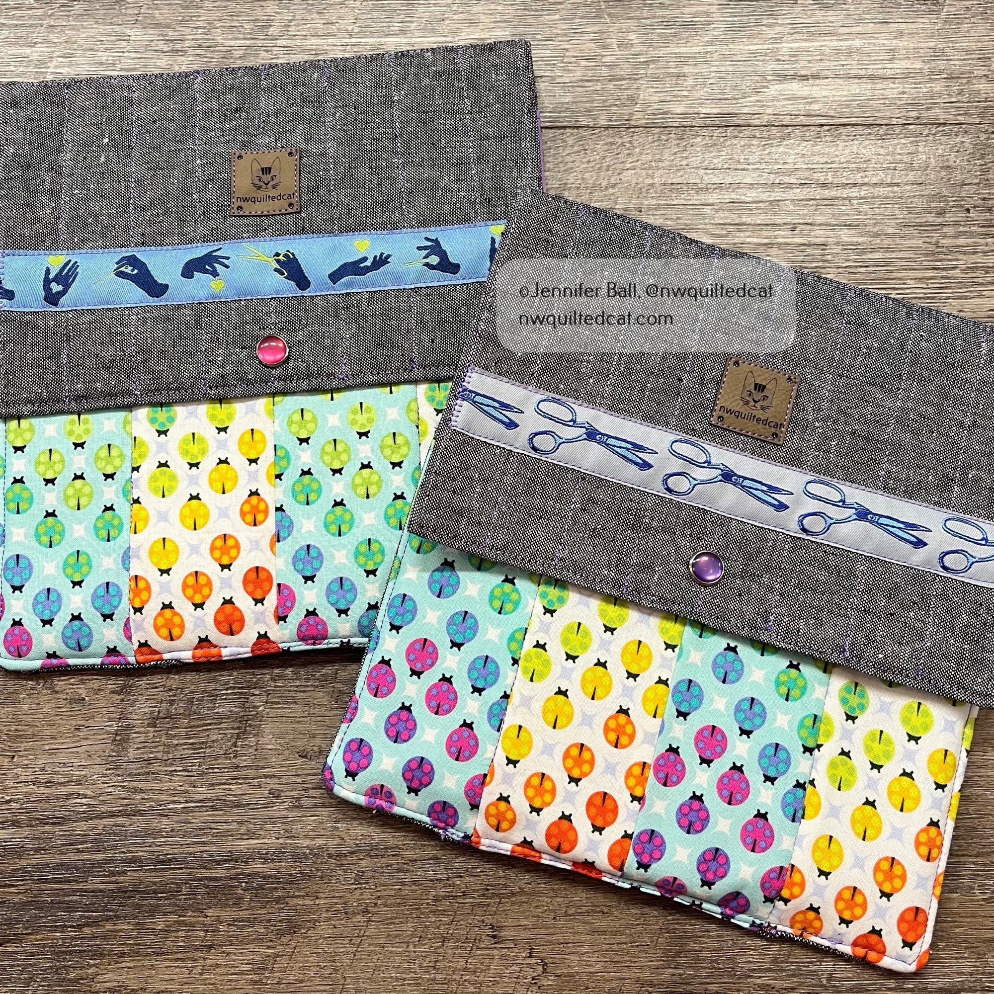 Each holder uses the same Painted Ladies fabric in alternating “glow” and “glimmer” colorways. The “glow” colorway is the white background and the “glimmer” colorway is the aqua background. I had a fat quarter stack of the Tiny Dots and Stripes prints so I used a different one for each rotary holder. I really love how colorway these little cases are all together!