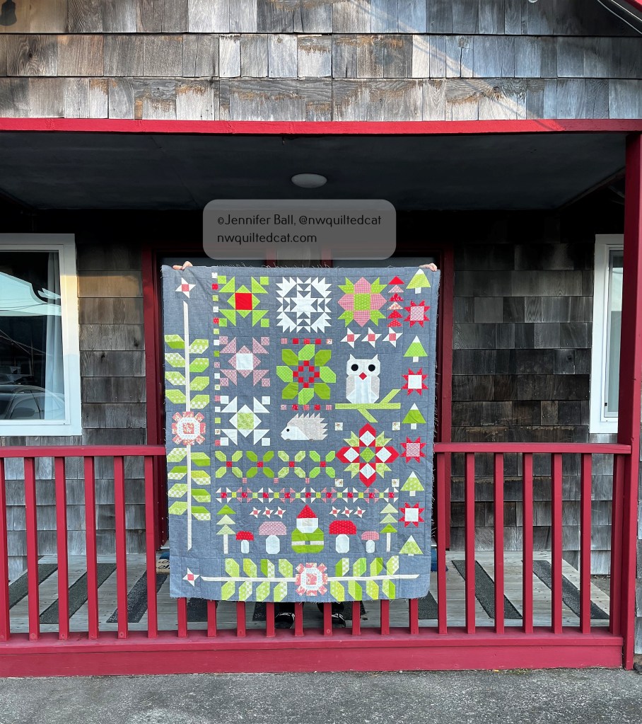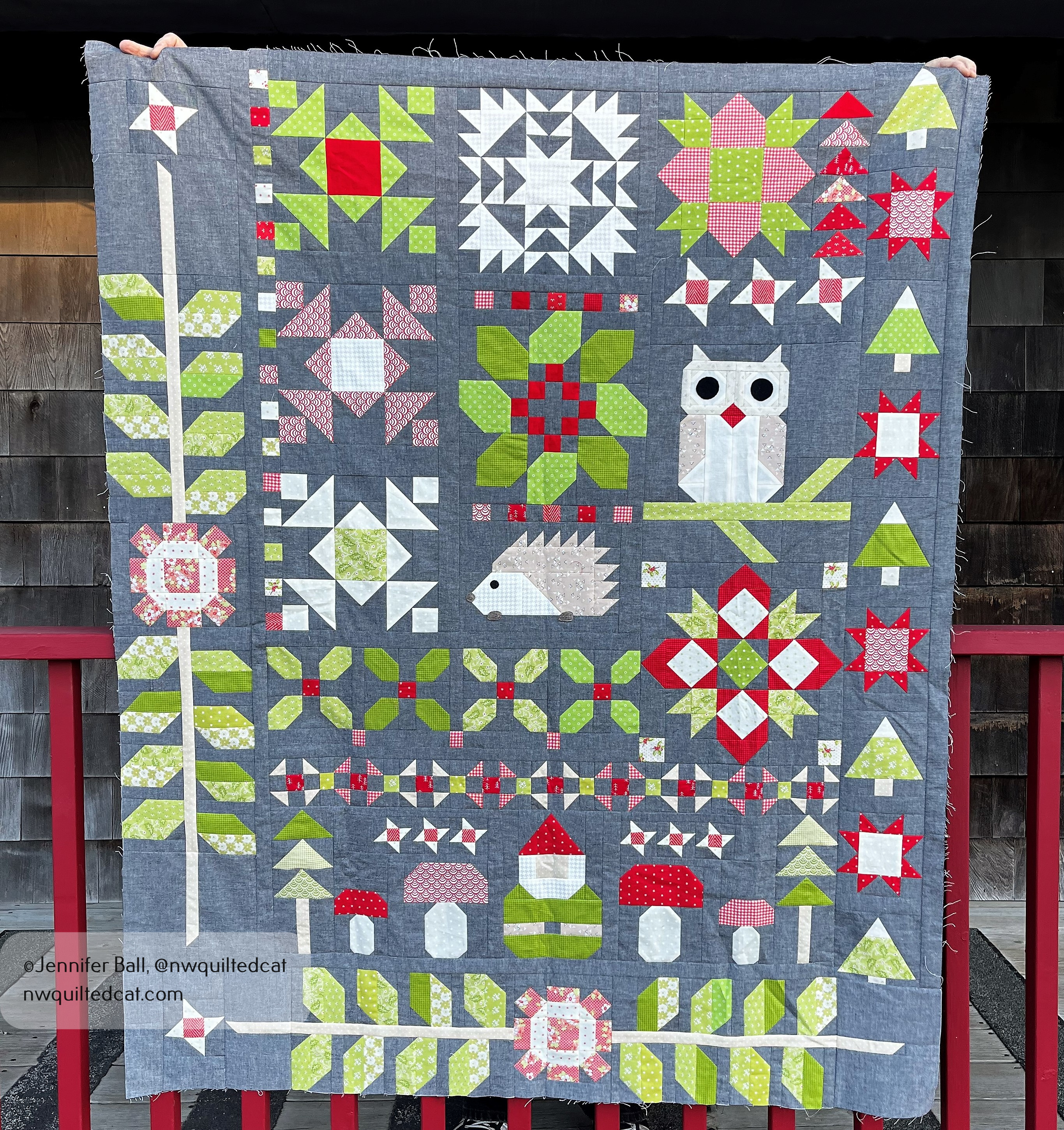 I really enjoyed making this quilt. It’s all traditionally pieced with only a couple of appliqued features on the owl and hedgehog. The printed fabrics are all from the original block-of-the-month, and I think they are all Fig Tree fabrics. The background is black chambray from Moda, which really sets off all the green, red, and cream fabrics wonderfully!