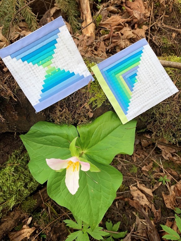 My quilt inspector sometimes likes to rearrange things when I’m not looking! I sewed the rows together and finished the quilt flimsy in time to take on a little mom and son hiking trip. My son was a good sport and held up the quilt top while I took a quick picture.