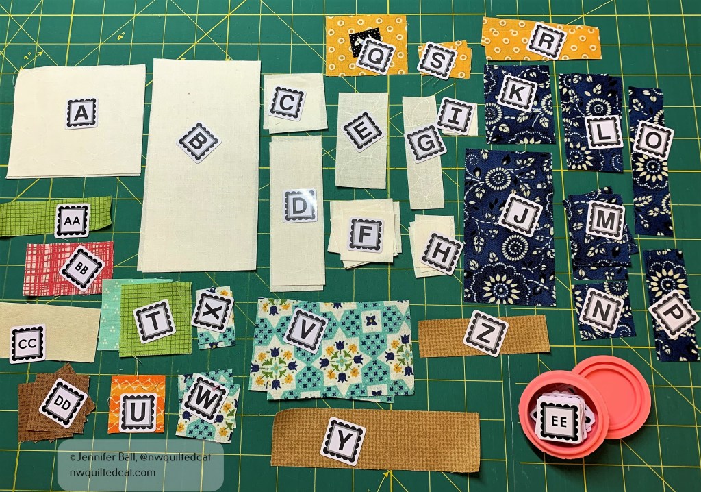 When I work on these smaller 6-inch blocks with many pieces, I like to label them with Alphabitties and place them on little design boards. You can make design boards by using a foam board, batting scraps, and fabric scraps for the binding or purchase them here.