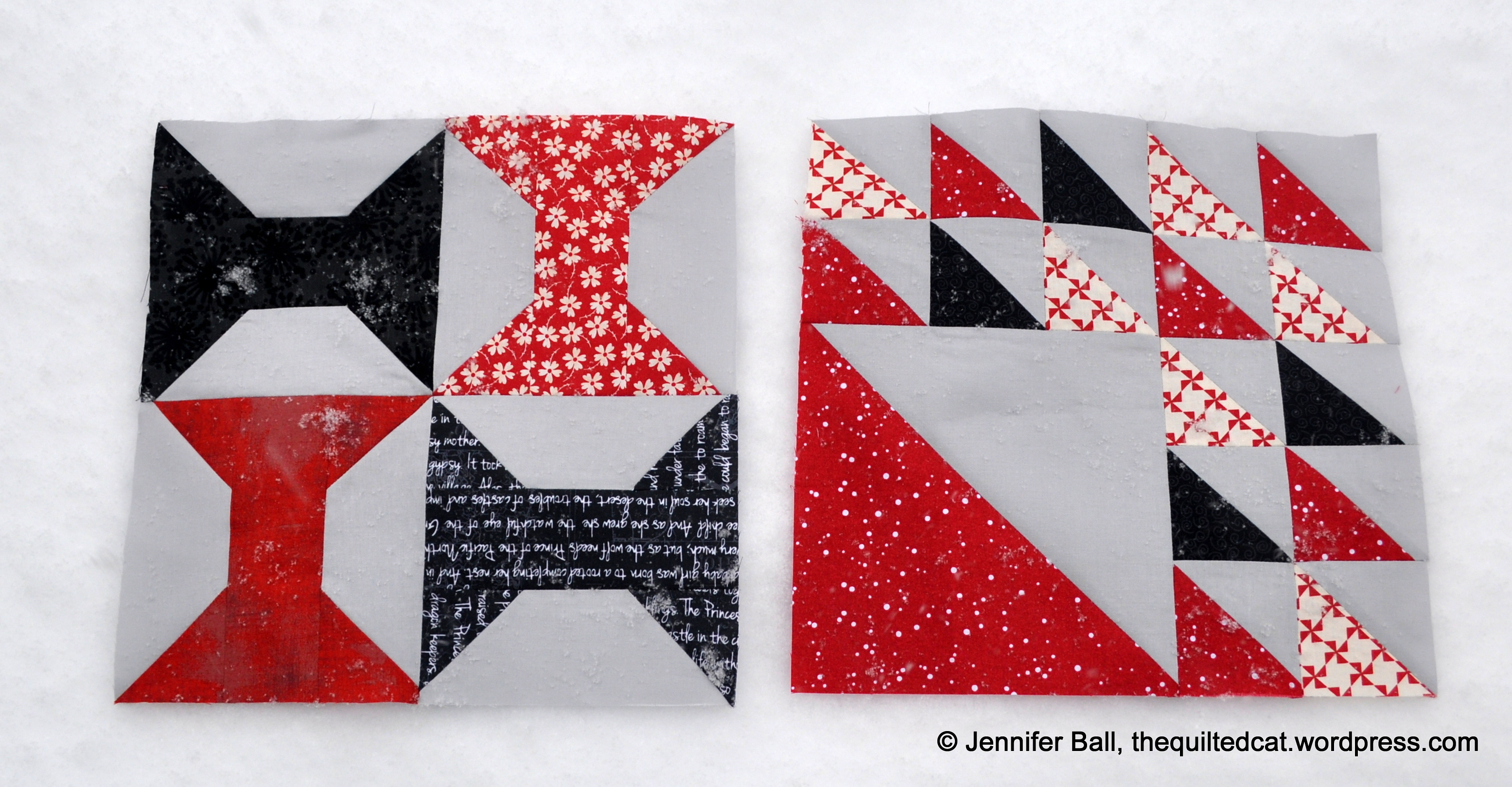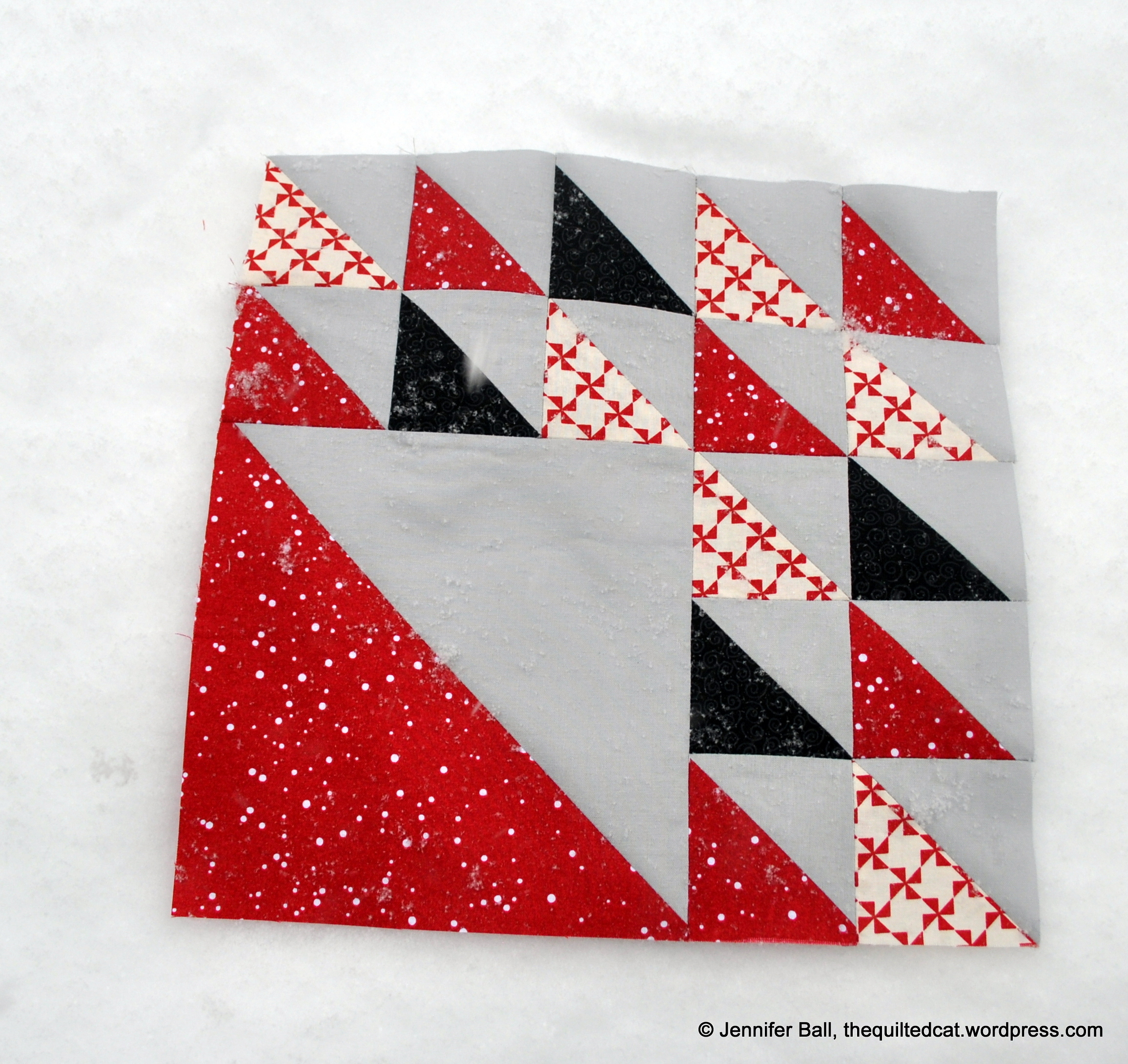 Here’s a look at my block in the snow using red and black fabrics from my stash. My background fabric is Kona cotton in Shadow.