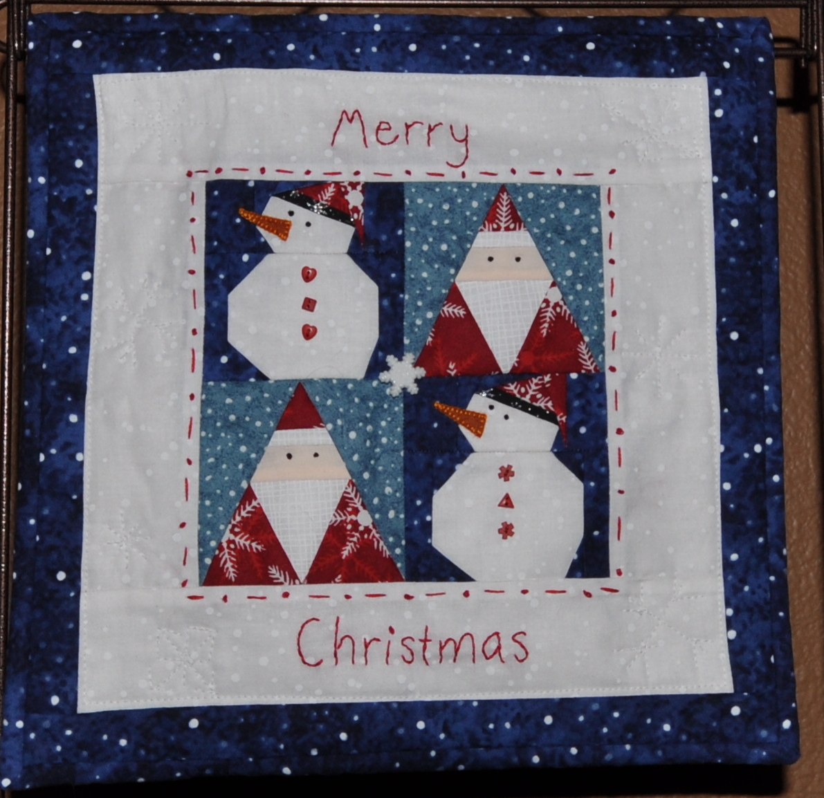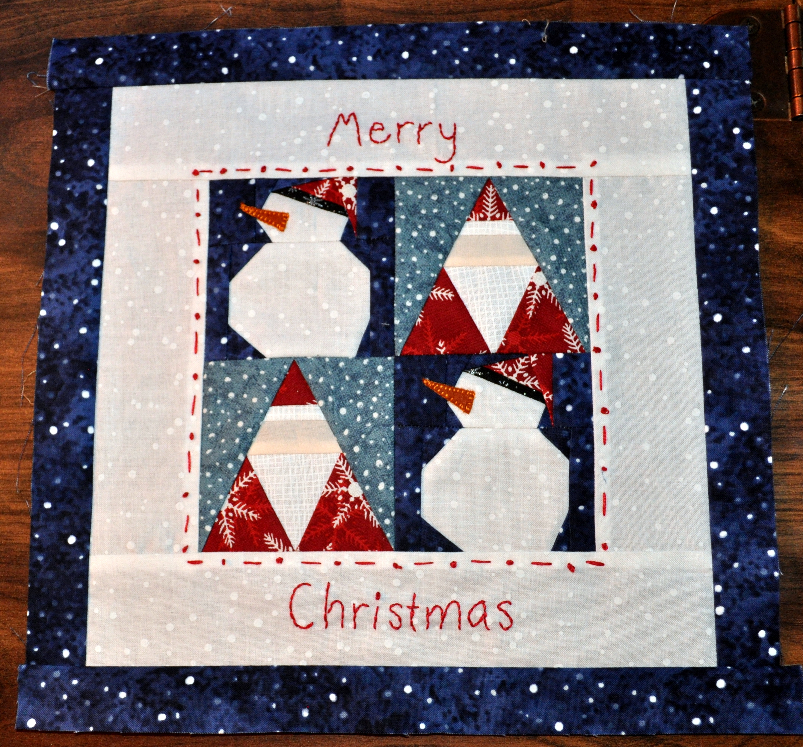 First, I used 2 of the snowmen blocks and 2 of the Santa blocks and alternated them to make a little square.