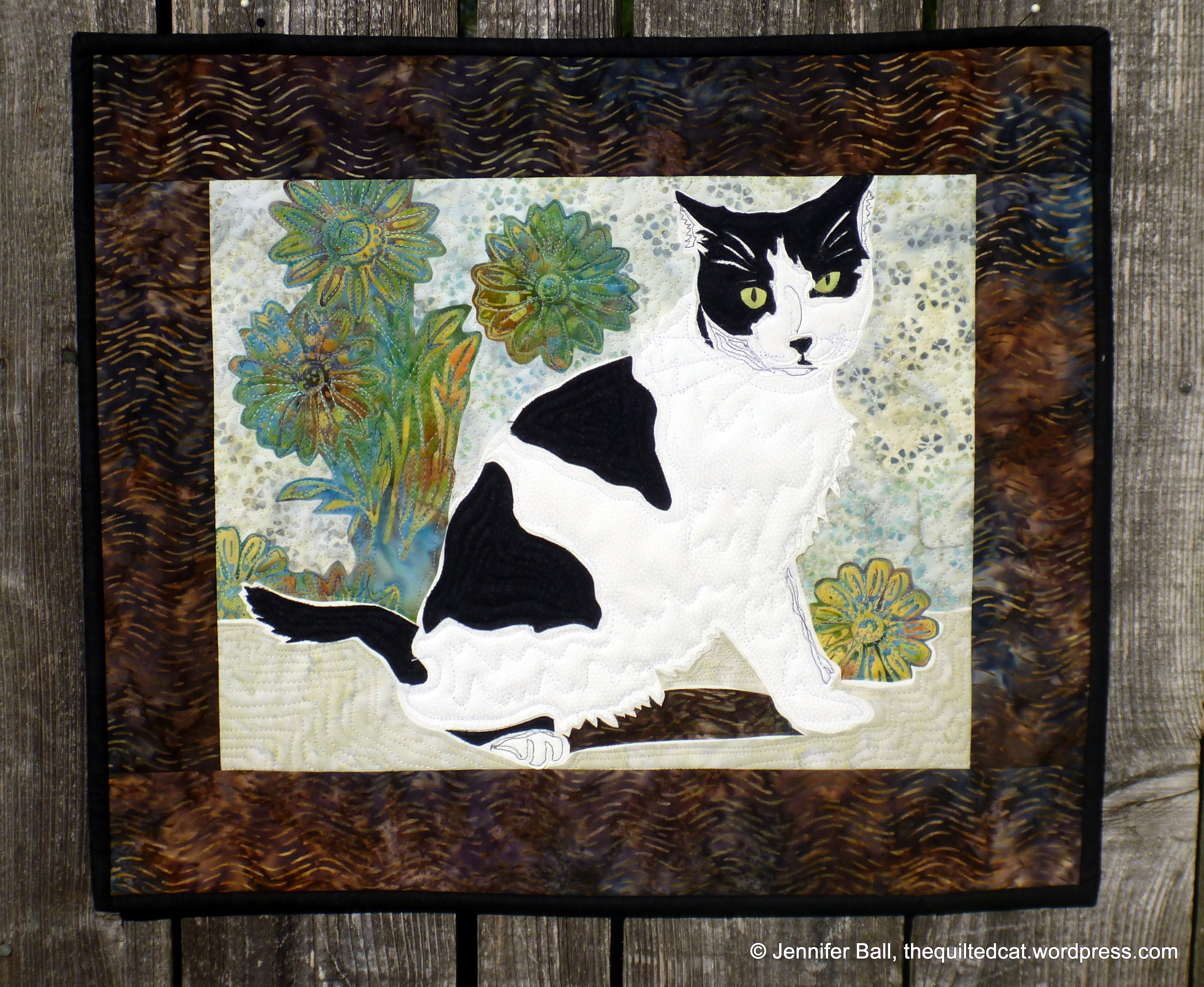 Of course, one of my quilt inspectors strolled by to supervise the photo session. My cat, Cow, is just off to the side of the quilt, rolling in the dirt. He is loving this sunny weather!