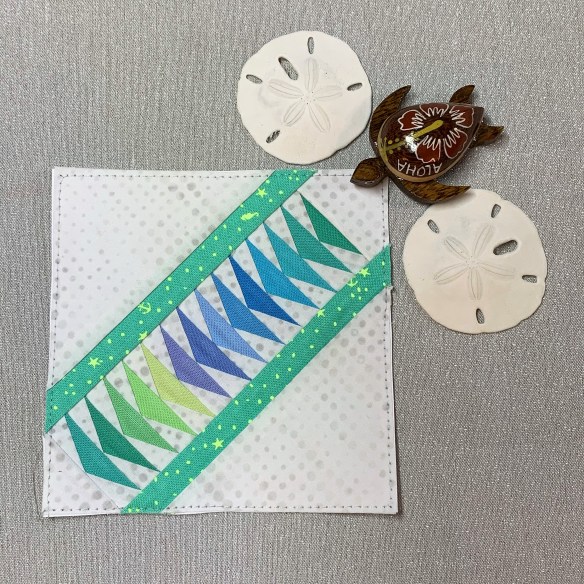For my binding, I used a print from Tula Pink’s Zuma line that perfectly complemented the Kona cotton colors that I used for my blocks. This is the same fabric line that I used for the little green print with the seahorses, stars, and anchors in my blocks.
