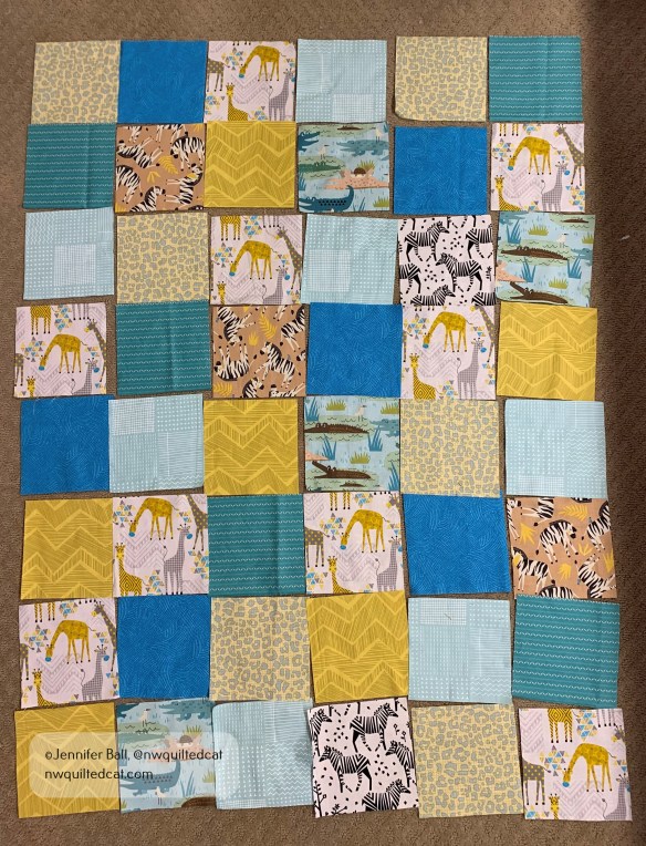 I cut out 48 squares at 5.5 inches unfinished, and then set them out in 8 rows of 6 blocks each.