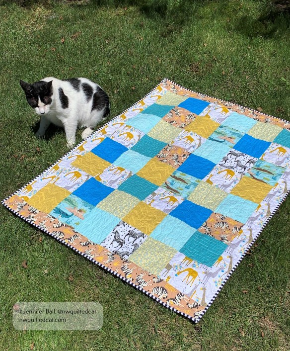 I decided to put together a simple and quick baby quilt using fat quarters and scraps from my stash. I had some super cute safari themed fabric with giraffes, zebras, and alligators that I thought would be perfect for a baby boy.