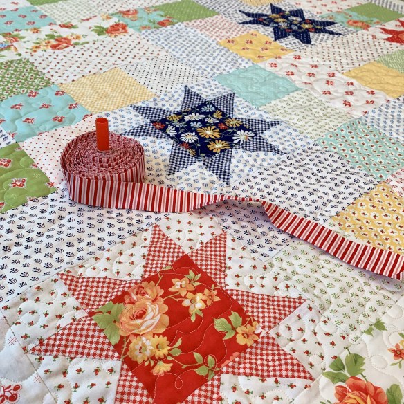 Because I’m going to use this quilt as a lap quilt and a picnic quilt, I decided to complete my entire binding by machine. This not only saves time, but it holds up better with repeated machine washings.