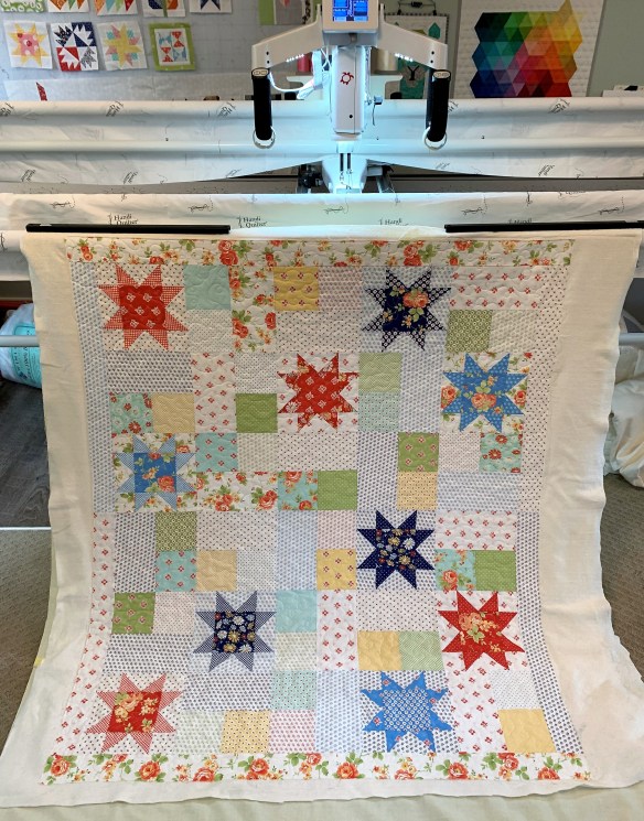 I’m happy to share my completed Catalina Stars quilt with you. In my last post, I talked about receiving this project in my first Little Box of Figs subscription, and I showed my quilt flimsy.