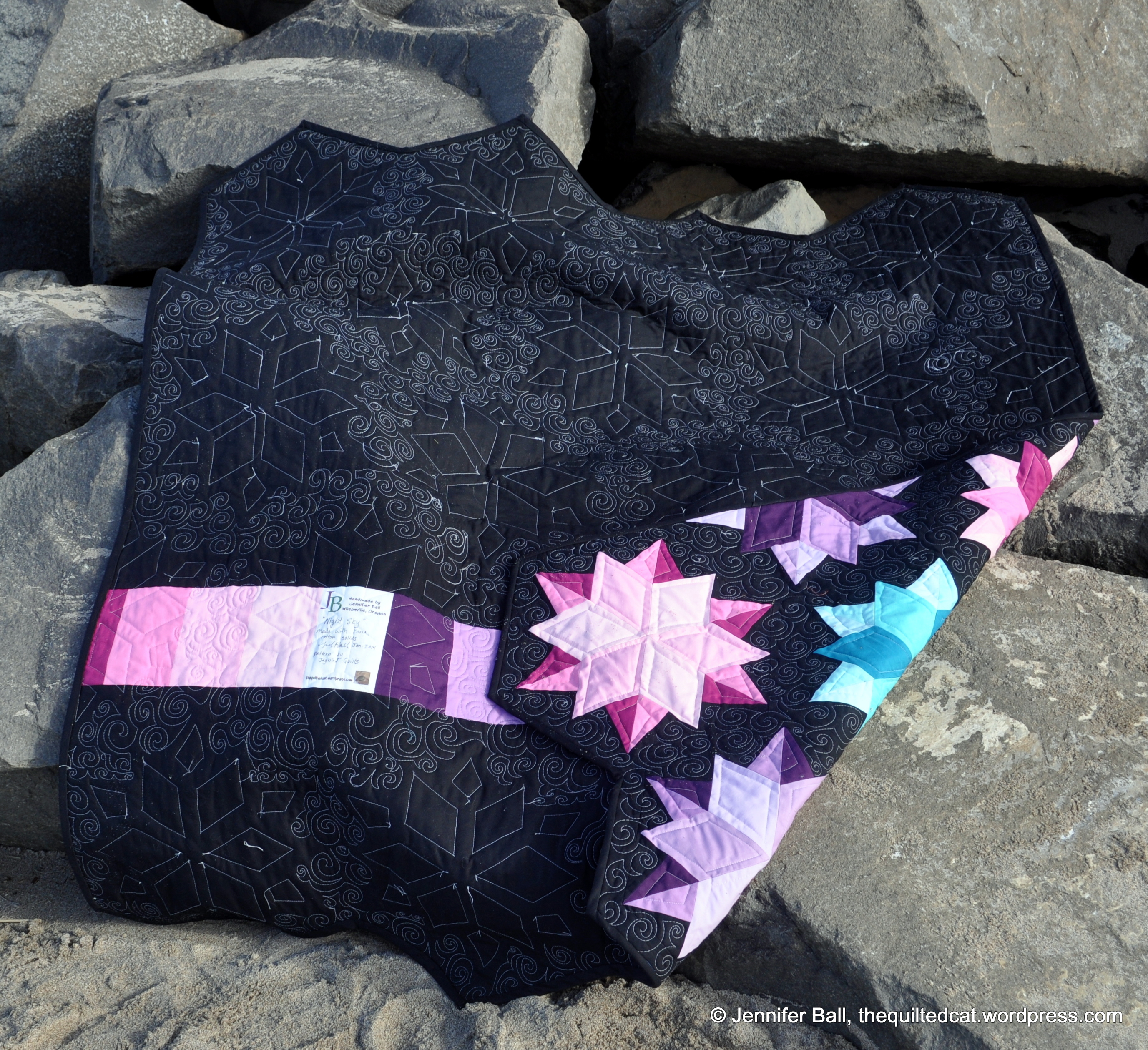 These last two pictures show the free-motion quilting that I did using the Genoa Gray thread. The quilting alone took me 12 hours! I did a swirly pattern in the black background and did some straight-edge echo quilting in the colored starbursts.
