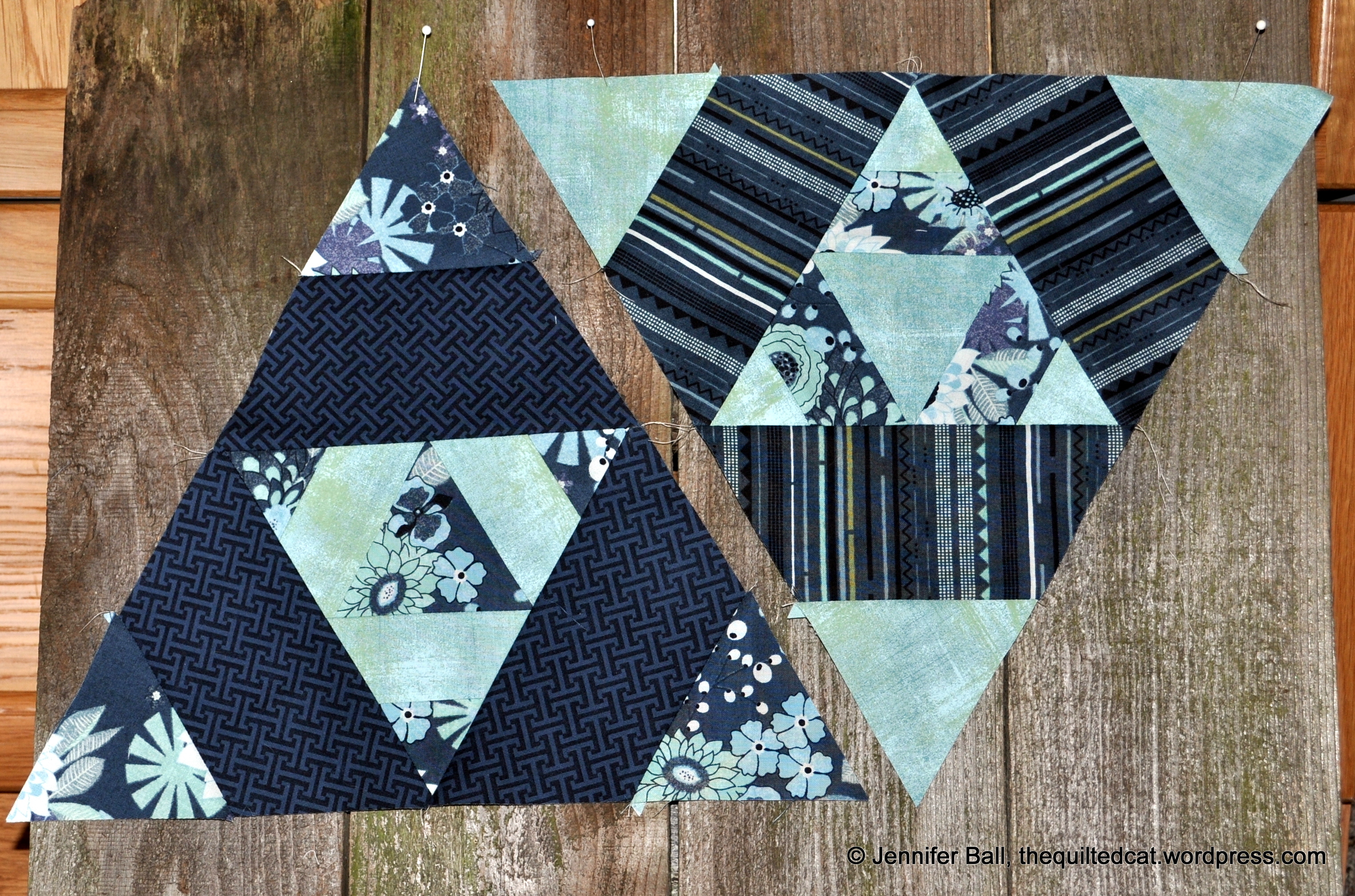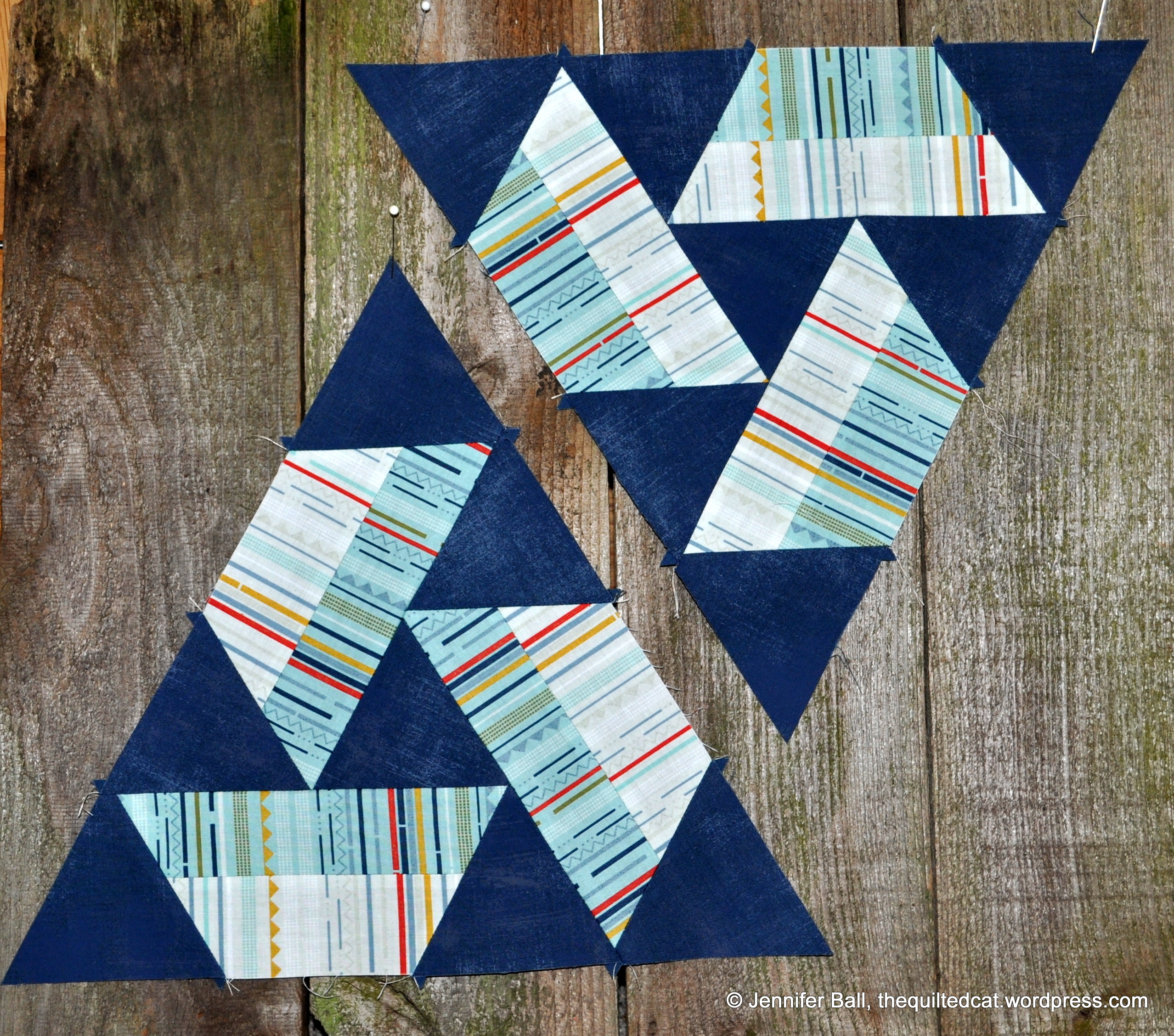 Next, I selected the Night Sky pattern by Jaybird Quilts for its striking beauty! This quilt uses her sidekick ruler to create the triangle and diamond shapes that are used in the construction of the quilt. Each starbust (or starfish?) has 4 different shades of a color group.