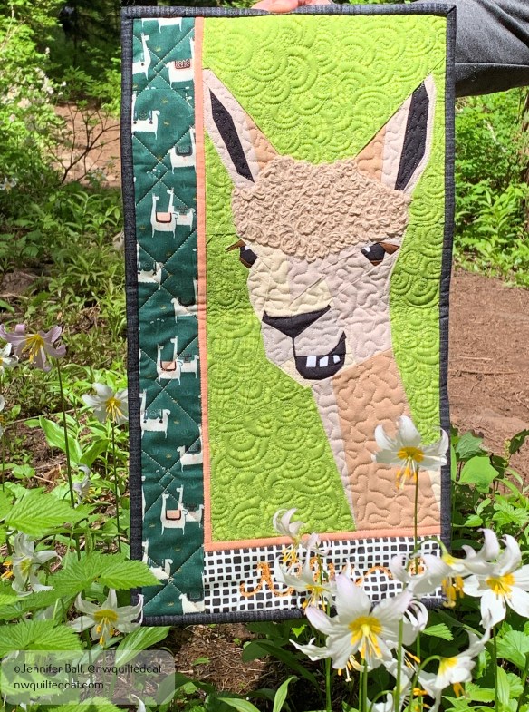 Let’s take a closer look at Alfie the alpaca! I based this pattern on a photo that I took of a cheeky little alpaca in Sisters, Oregon during summer 2019. I used Cherrywood fabrics for the alpaca body, and Pie Making Day in Key Lime from RJR fabrics for the background. I pieced each section of the pattern, and then pinned the sections to a design board before stitching them together. This process helps you to catch any fabric placement mistakes before the whole block is stitched together.