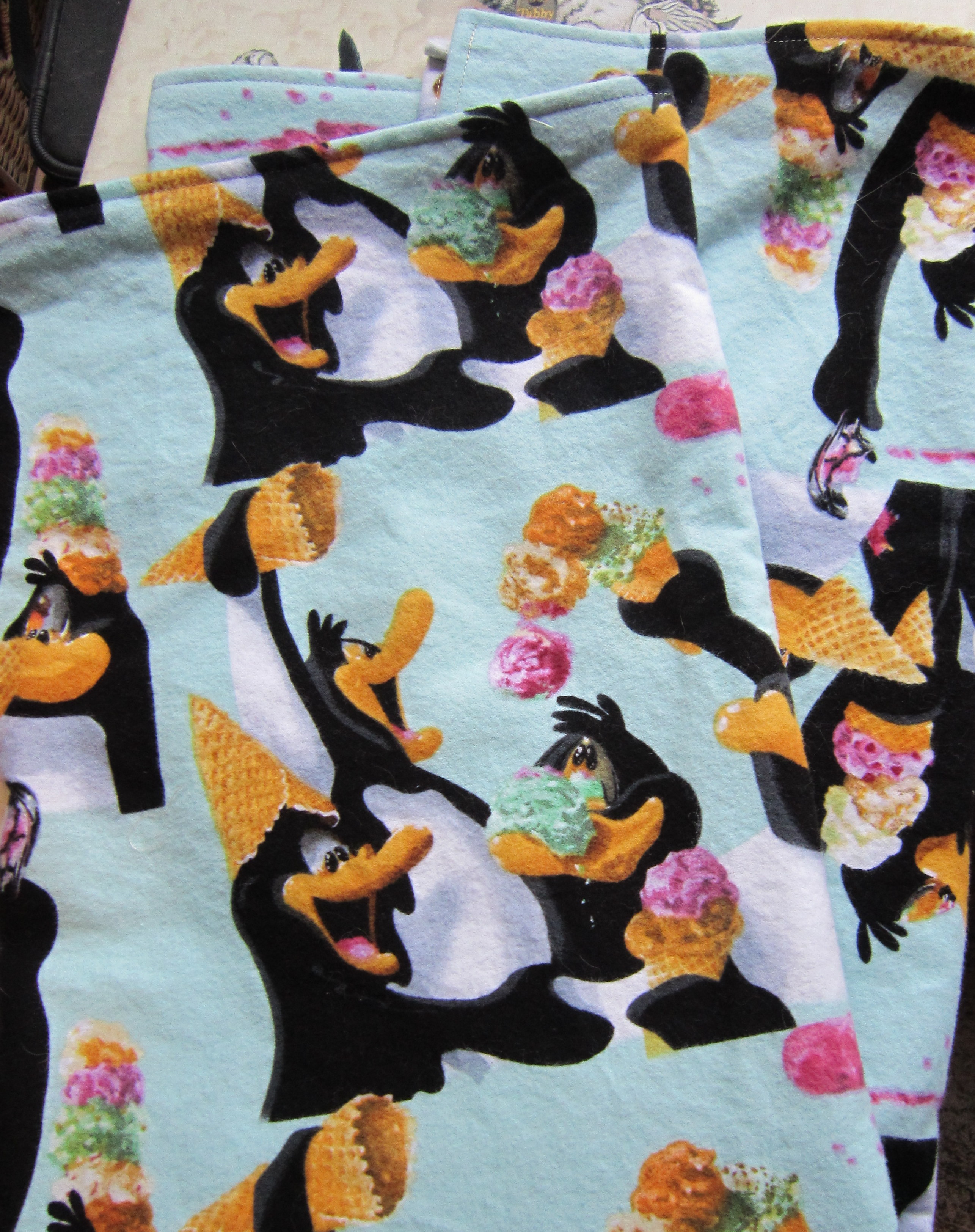 I had a difficult time finding a bird print that wasn’t too babyish or too girly. I knew he wouldn’t want cute little owls on a pink background! As I was searching, I spotted the perfect fabric. It had crazy penguins and ice cream cones and it was a soft flannel.